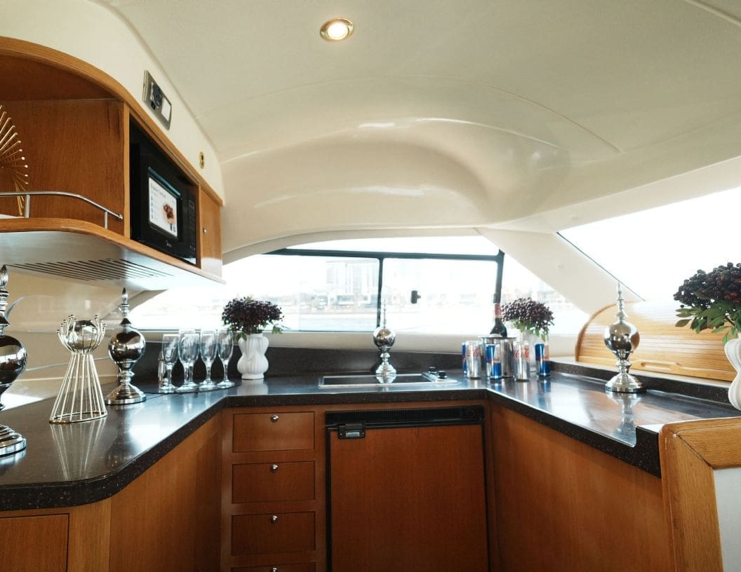The open deck provides plenty of space to socialise and soak in Dubai’s skyline views, while the inviting saloon offers a comfortable retreat indoors. With captain, crew, and fuel included, every part of your journey is taken care of.